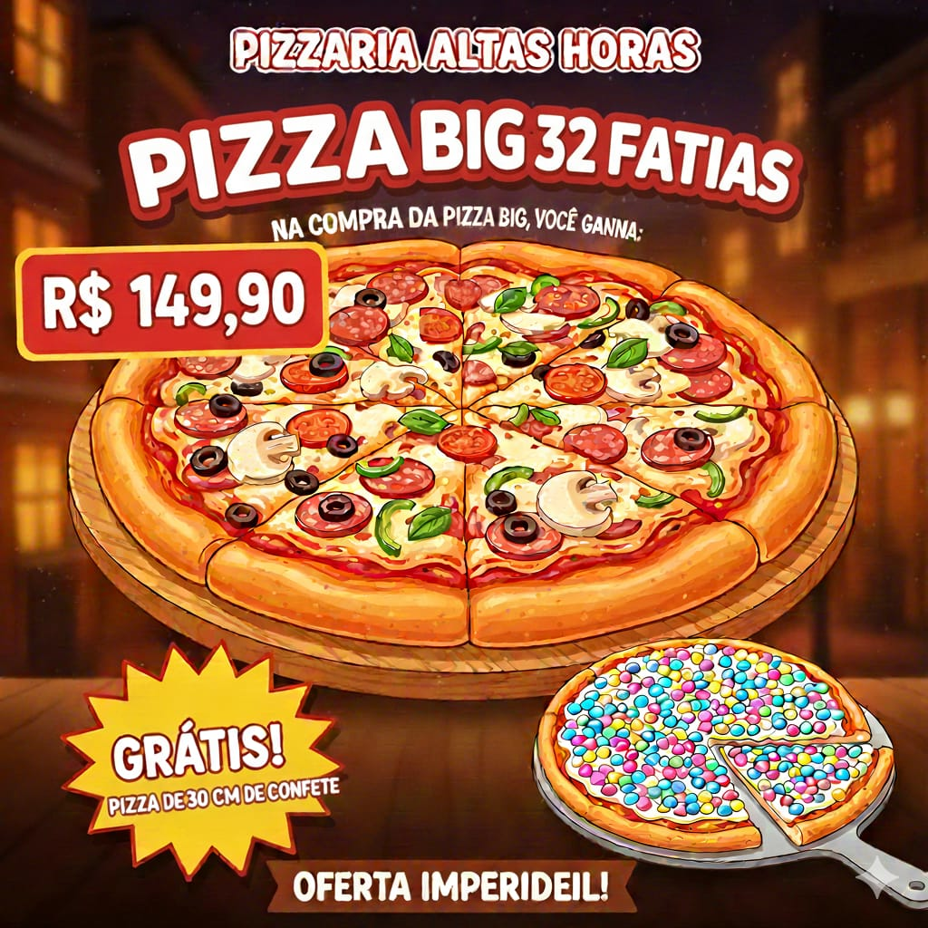 PIZZA BIG ALTAS HORAS, ATÉ 4 SABORES, 32 FATIAS GRÁTIS PIZZA 30CM CONFETE