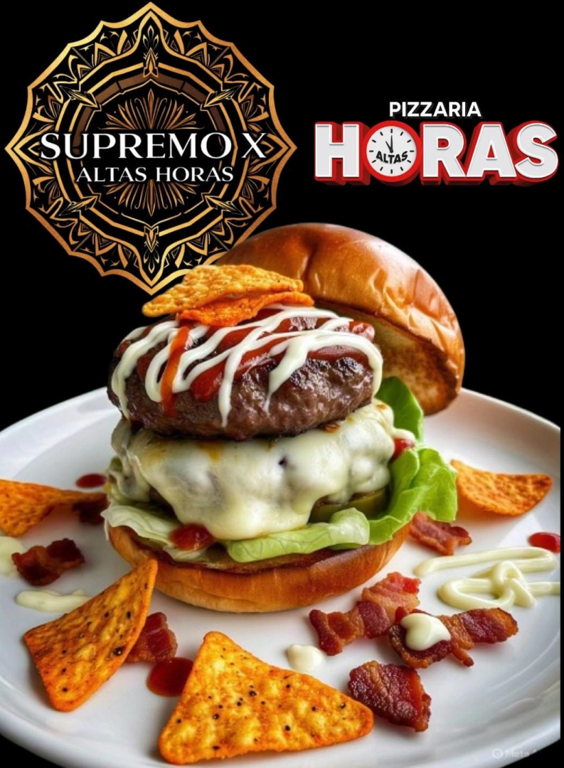 O Supremo X Altas Horas é um lanche incrível! Com dois hambúrgueres suculentos de 140g cada, queijo mussarela derretido, EMPANADO NO DORITOS , picles, alface fresca, um ovo, maionese cremosa e o molho especial da casa. E para completar, Doritos crocantes, bacon crocante e calabresa saborosa, tudo isso entre um pão de brioche macio e delicioso. É um verdadeiro banquete noturno!