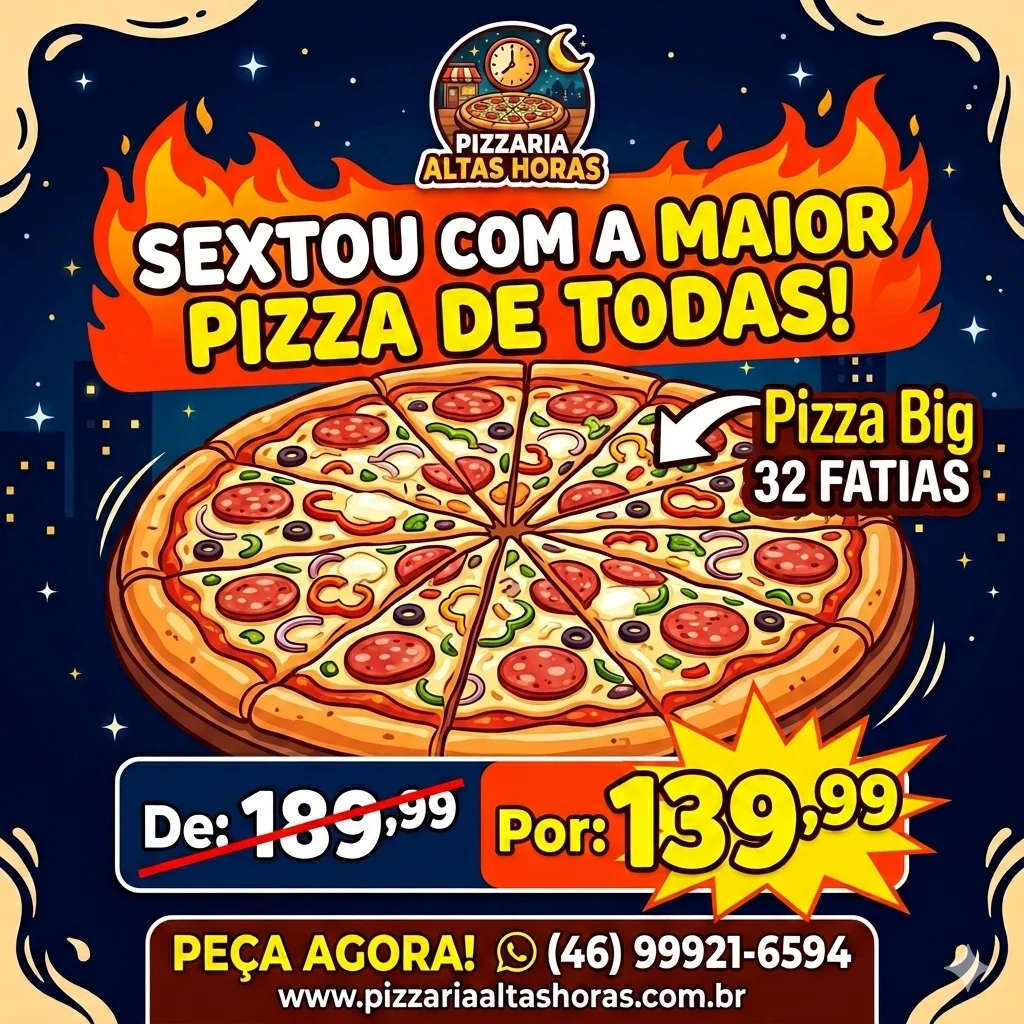 PIZZA BIG ALTAS HORAS, ATÉ 4 SABORES, 32 FATIAS + Tilápia 200G + FRITAS 200G