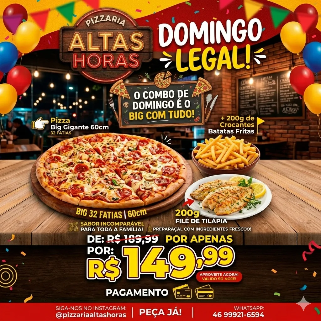 PIZZA BIG ALTAS HORAS, ATÉ 4 SABORES, 32 FATIAS + Tilápia 200G + FRITAS 200G