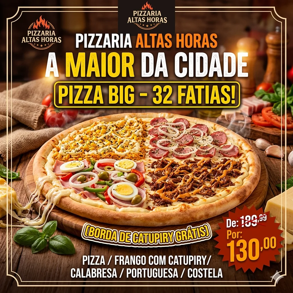 PIZZA BIG 32 FATIAS SABORES: FRANGO COM CATUPIRY, CALABRESA, PORTUGUESA E COSTELA