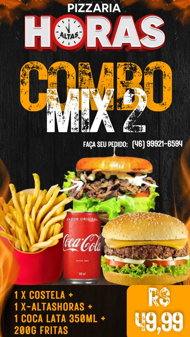 1x COSTELA + 1 x ALTAS HORAS + 1 COLA LATA 350ML + 200G FRITAS